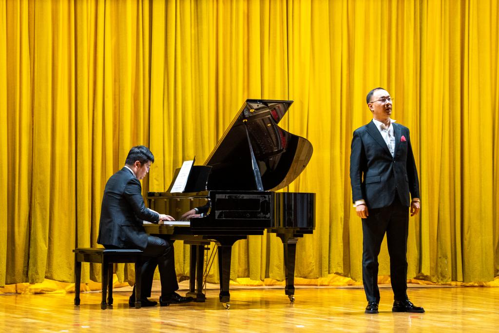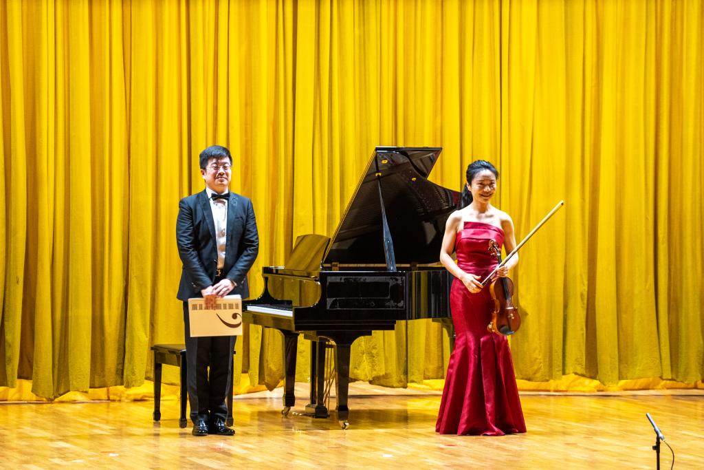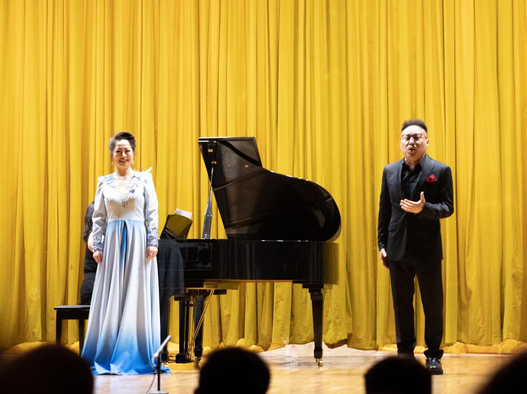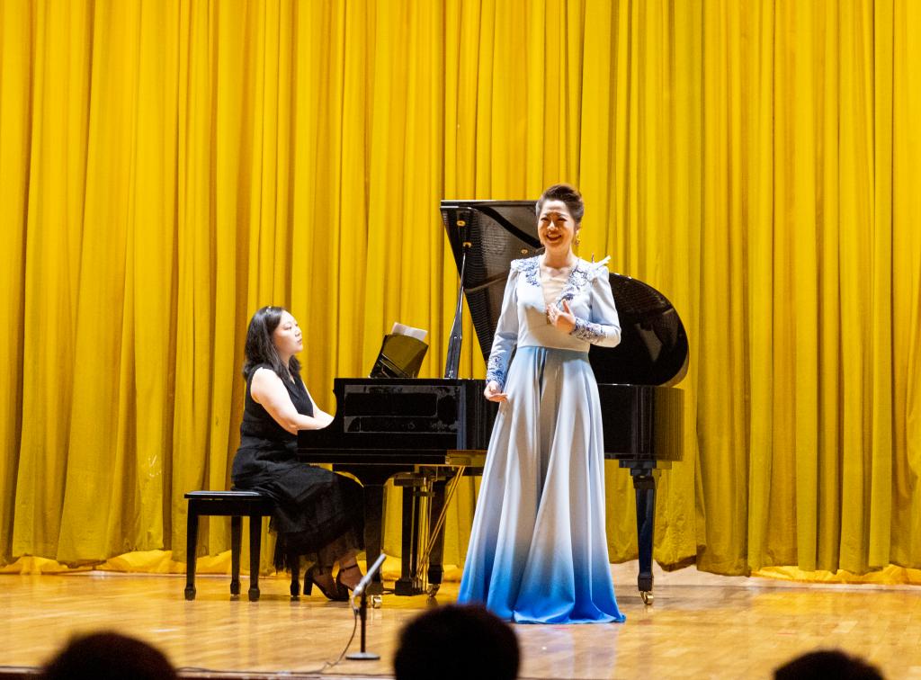 紧接着,张妍老师和刘娜老师一同带来歌剧《林徽因》中二重唱《一半》,完美重现了林徽因与梁思成追求事业及精神世界的热情。张妍老师带来《青玉案·元夕》独唱,全曲旋律优美动听,意境悠远,其中“众里寻他千百度,慕然回首,那人却在,灯火阑珊处” 也已成为广为传颂的千古名句。随后,李姣楠老师、俞斌老师带来《爱的礼赞》和《梁祝》小提琴和钢琴合奏,小提琴与大提琴的完美配合向大家描绘了一幅典雅的爱情画卷。吴多斐老师和刘娜老师带来《我爱你,中国》二重唱,坚定浑厚的歌声饱含深情,激发观众内心对祖国的热爱。最后,由全体演奏家带来《梨花有开放》合唱,花腔女高音与浑厚男高音的结合,单簧管、小提琴和钢琴的结合,将对母亲、童真和故乡的怀念之情推向高潮,使观众们沉浸其中,久久不能忘怀。